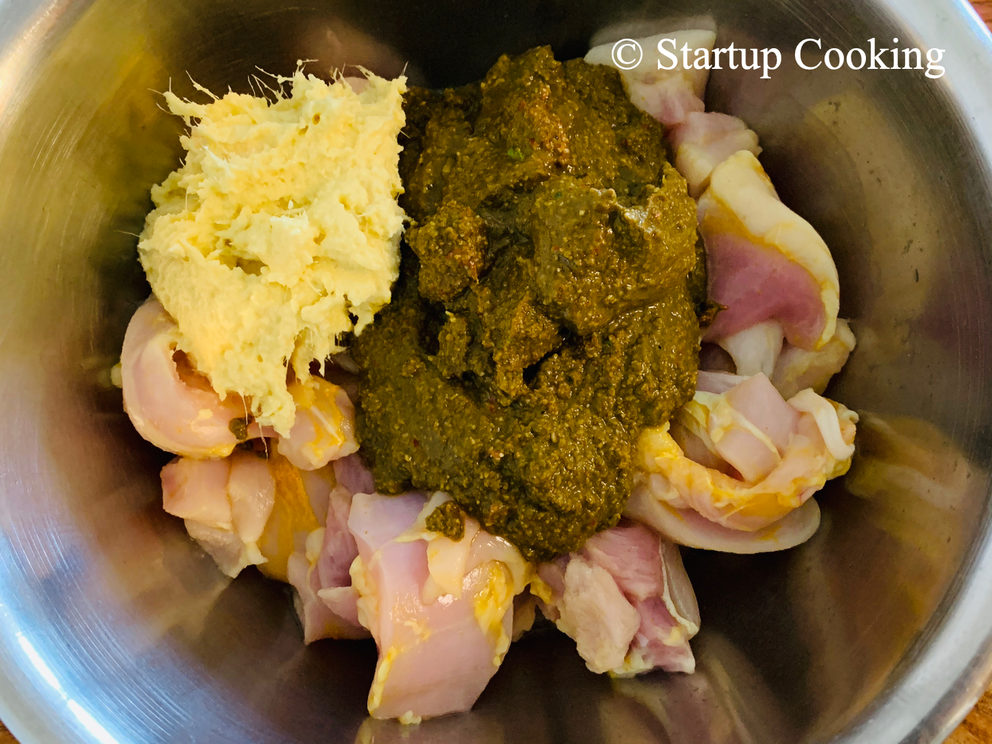 - in a mixing bowl, add freshly, cleaned boneless chicken, followed by ground paste, ginger garlic paste and kashmiri red chilli powder