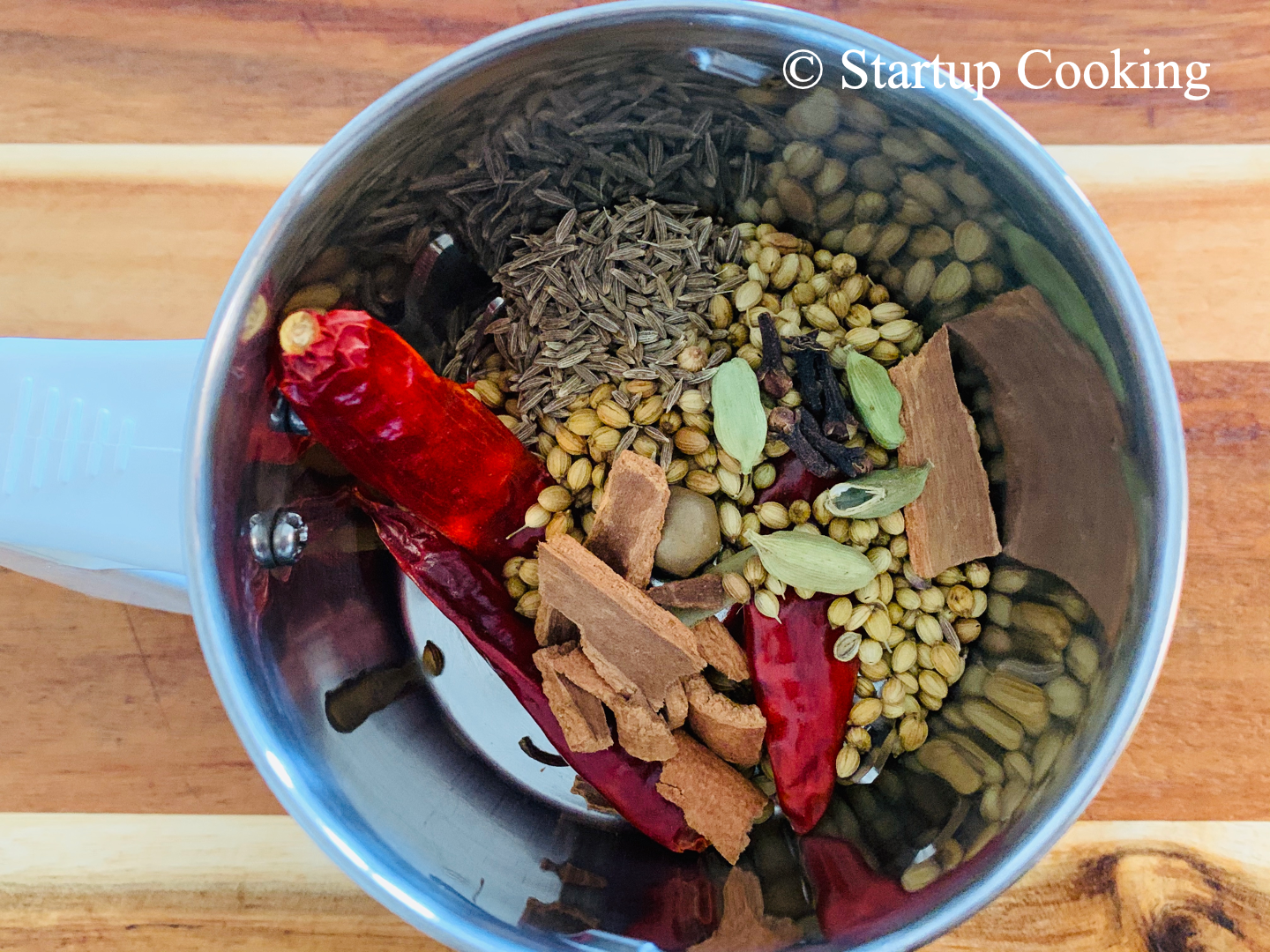 in a mixer grinder, add cloves, cinnamon stick, cardamom pods, cumin seeds, coriander seeds and red chilli