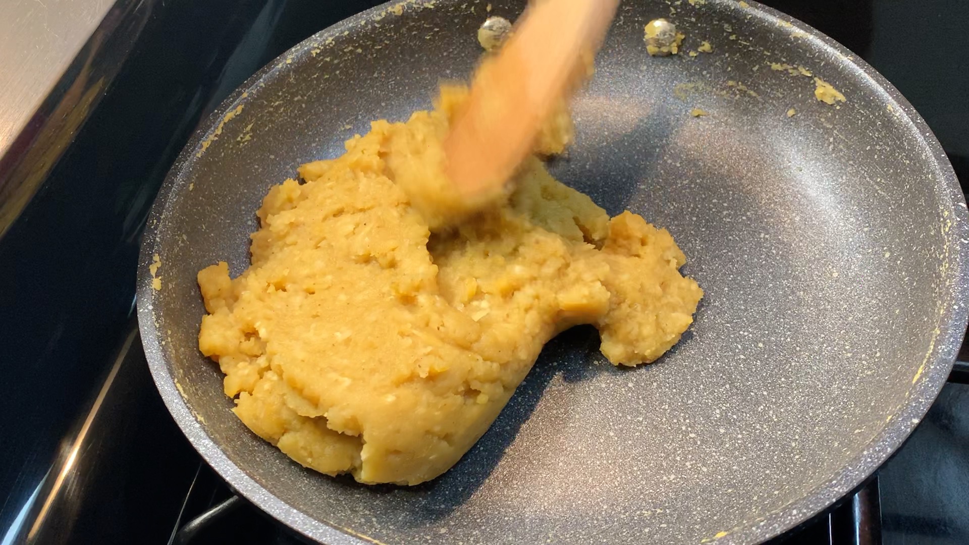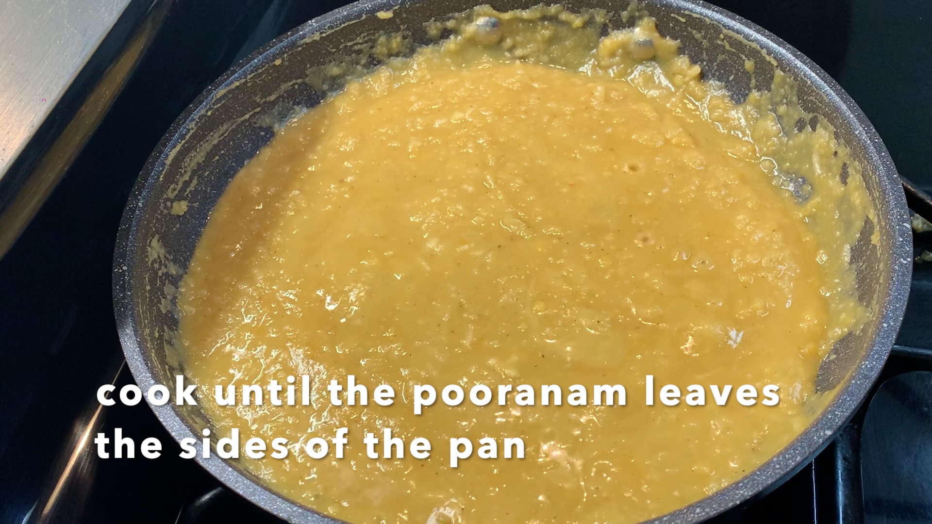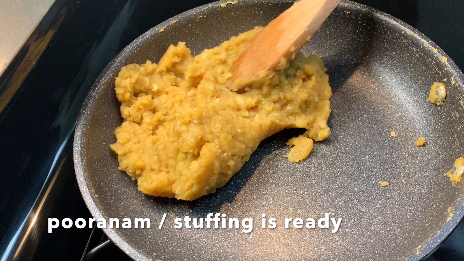 - mix well and cook until the Pooranam leaves the sides of the pan