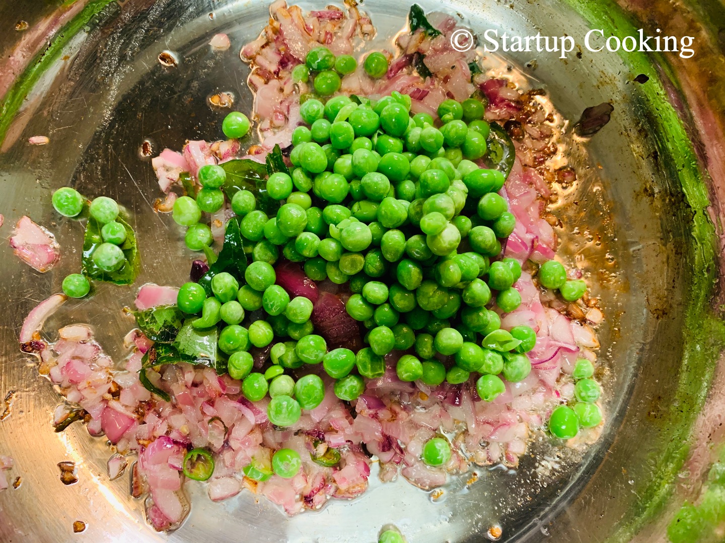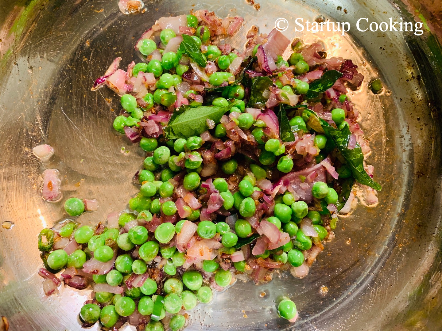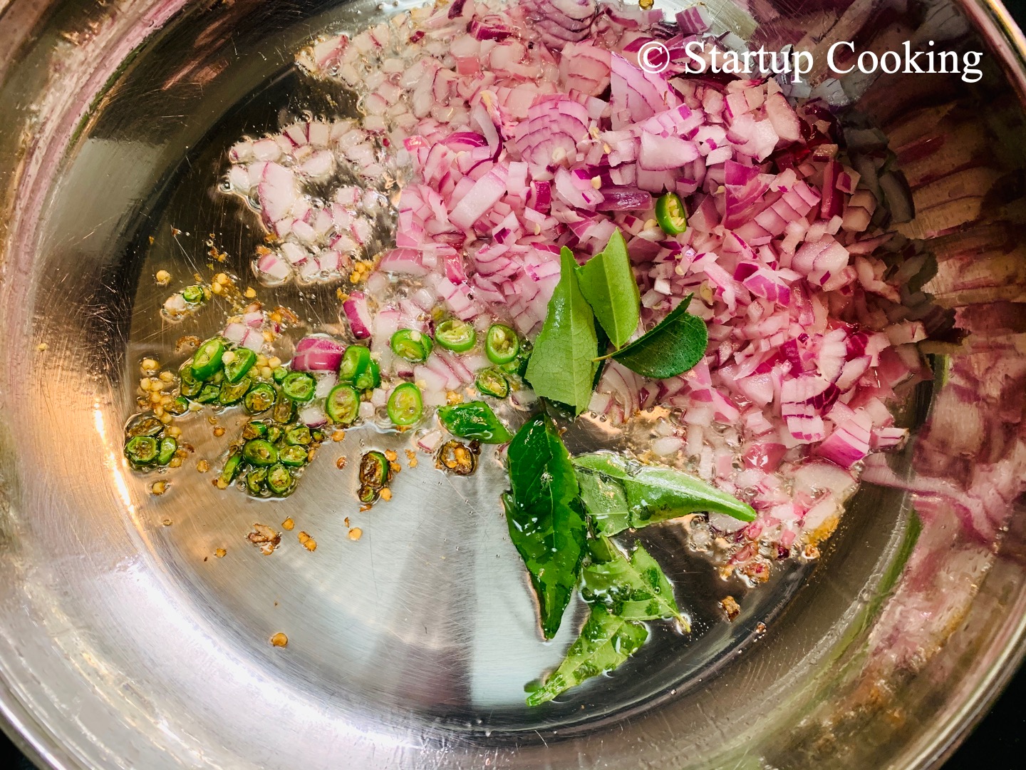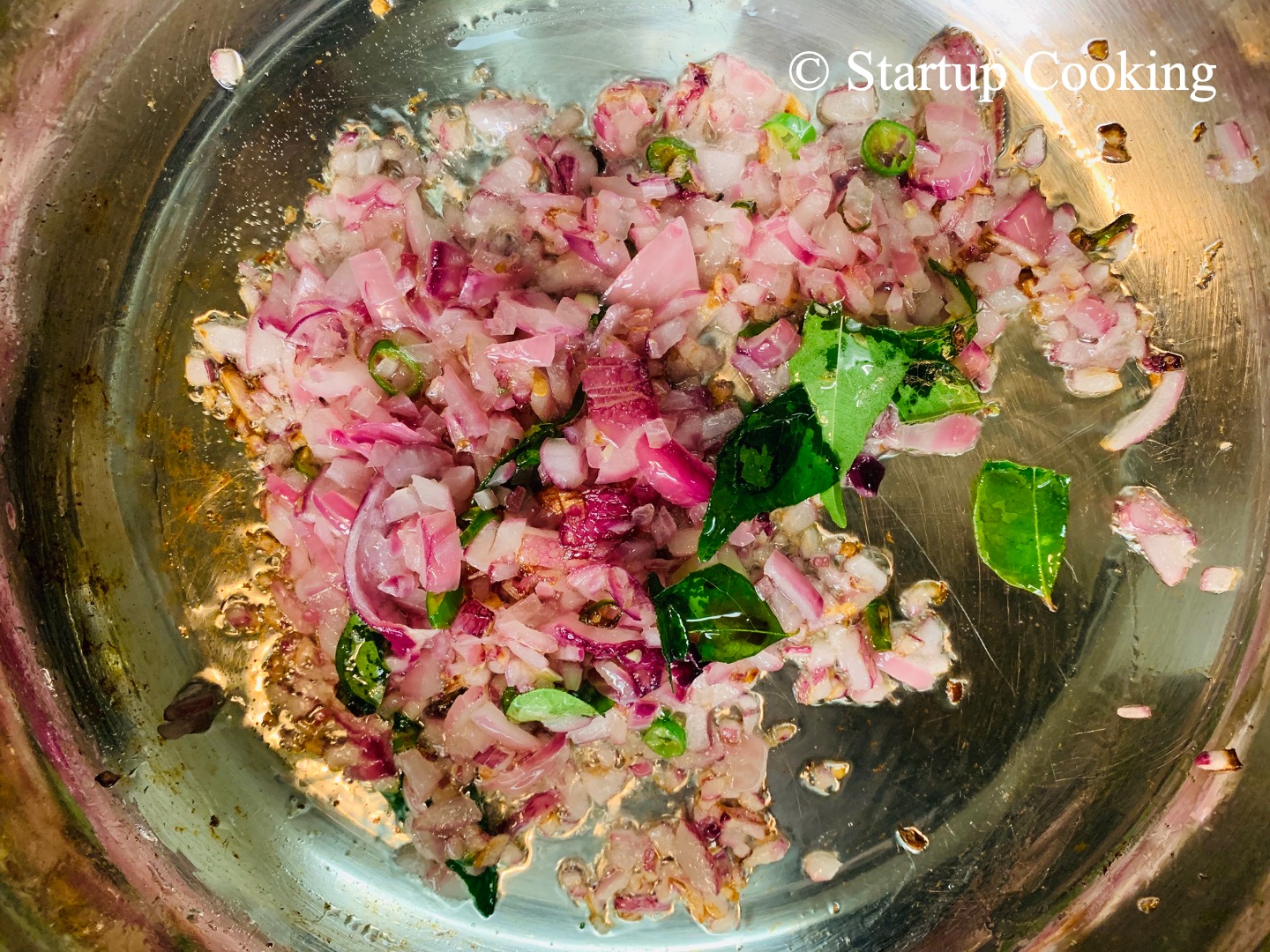 - heat oil in a pan, add chopped onion, green chilli and curry leaves