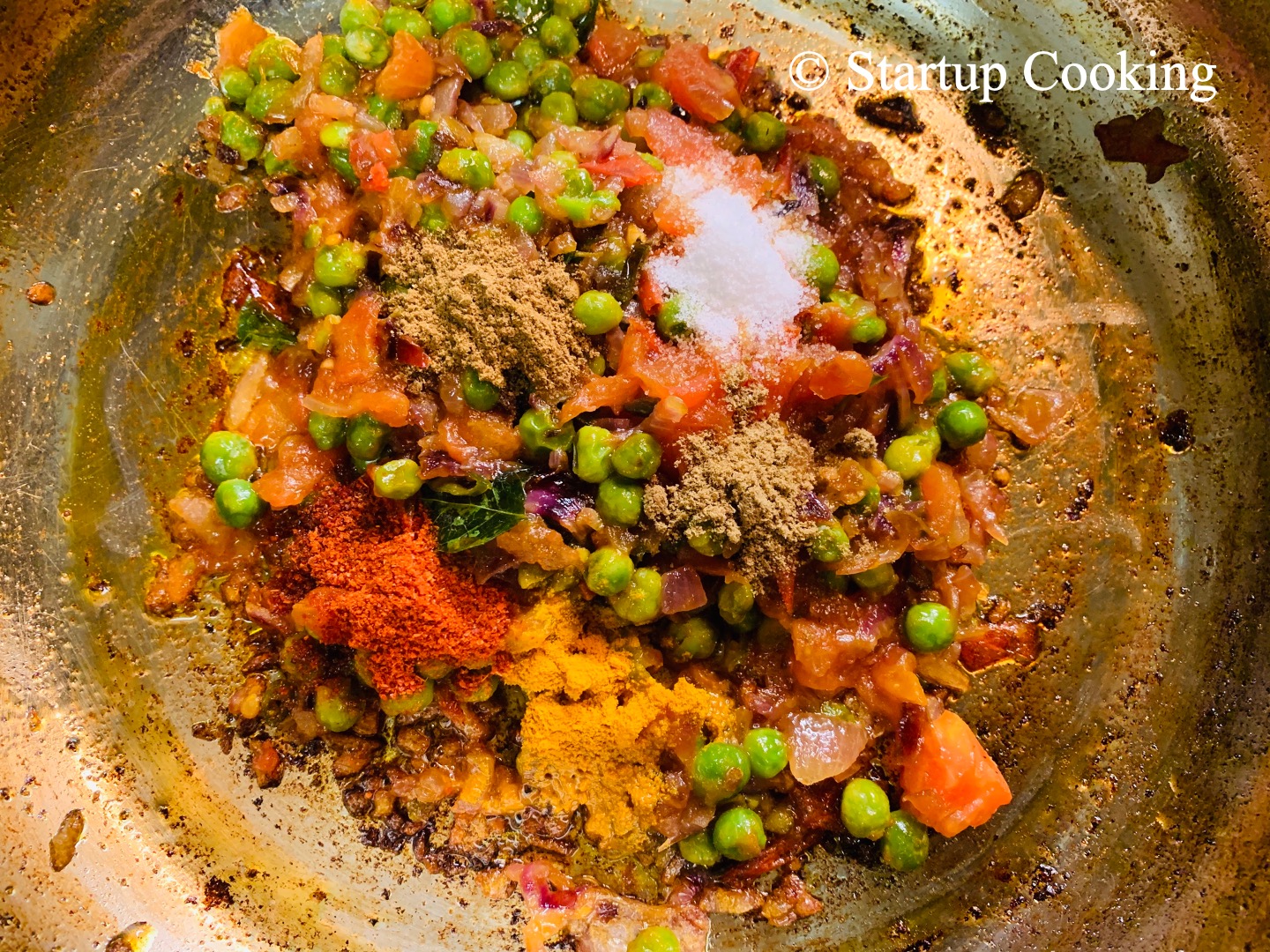 add turmeric powder, red chili, coriander, cumin powder and salt