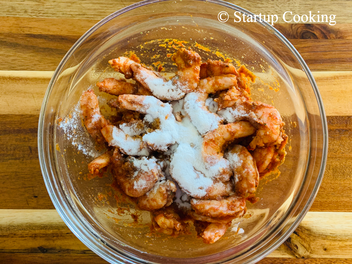- add rice flour to the marinated prawns and mix well (this step is optional, rice flour gives slight crisp and texture to the prawns)