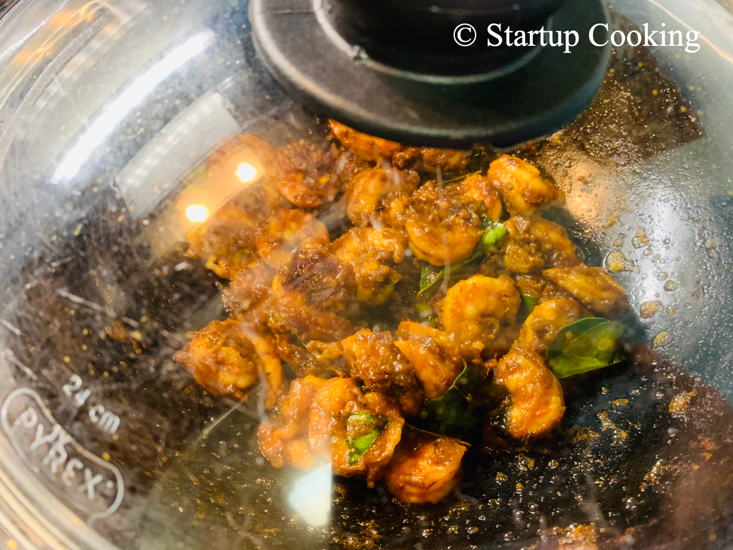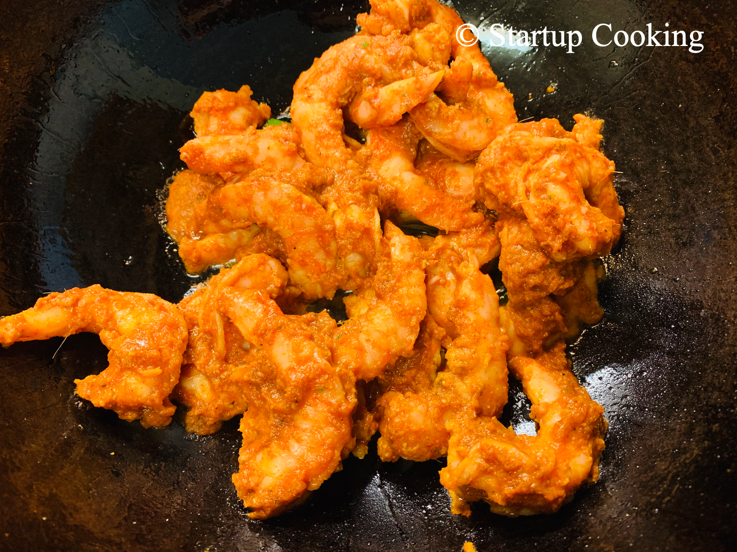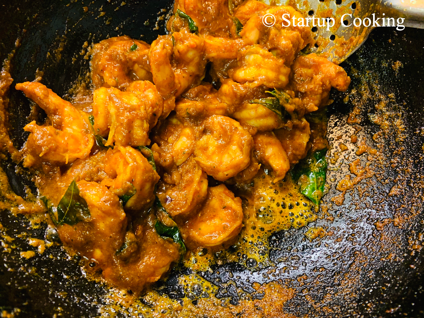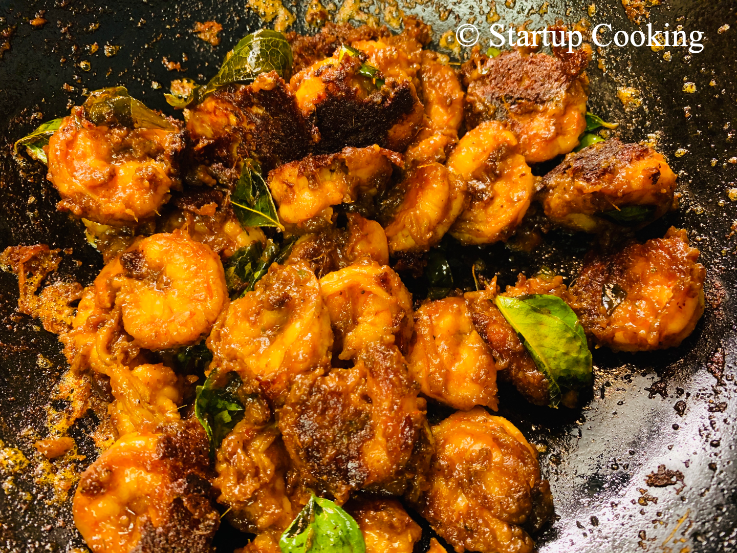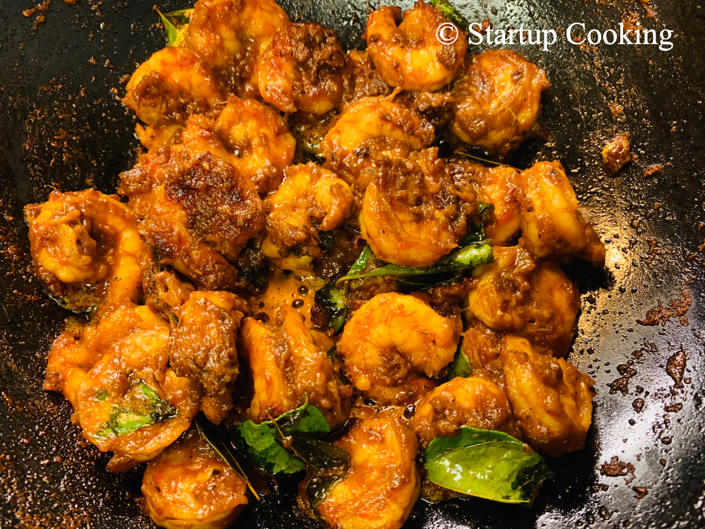 heat coconut oil in a cast iron wok, temper with curry leaves and then add marinated prawns