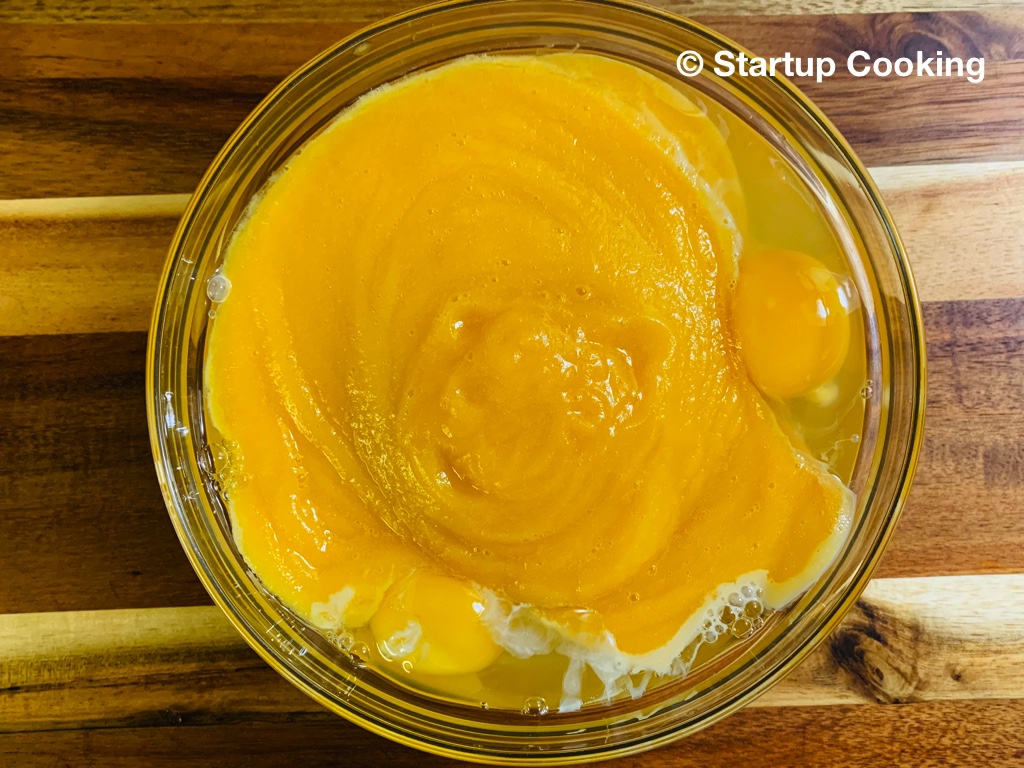 - in a large mixing bowl, whisk pumpkin puree, eggs and condensed milk