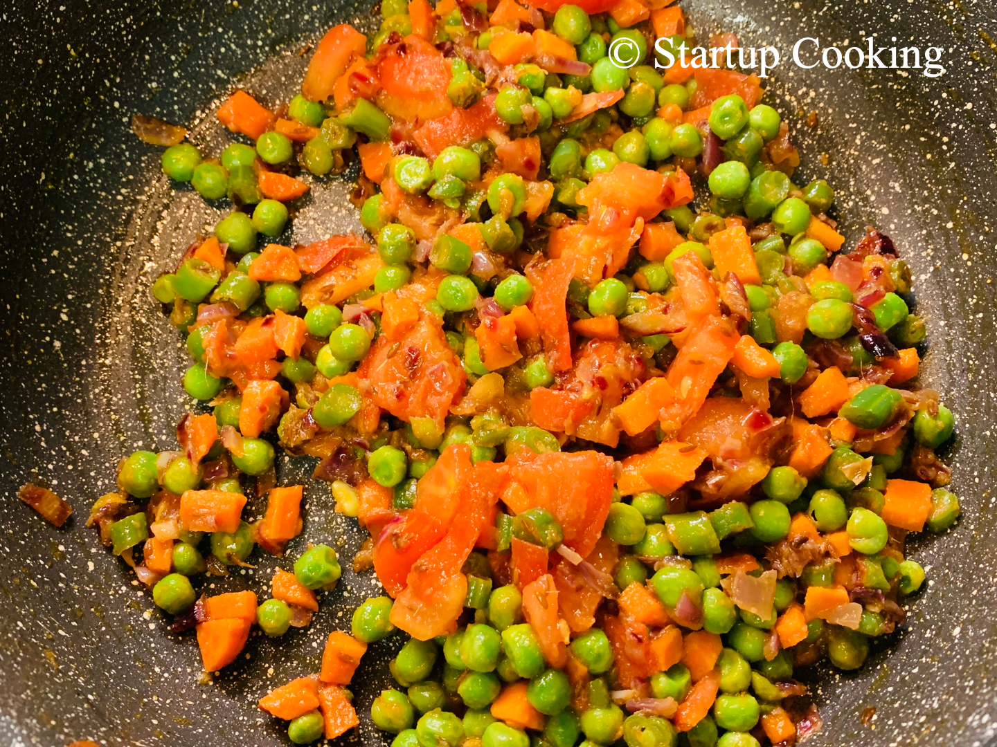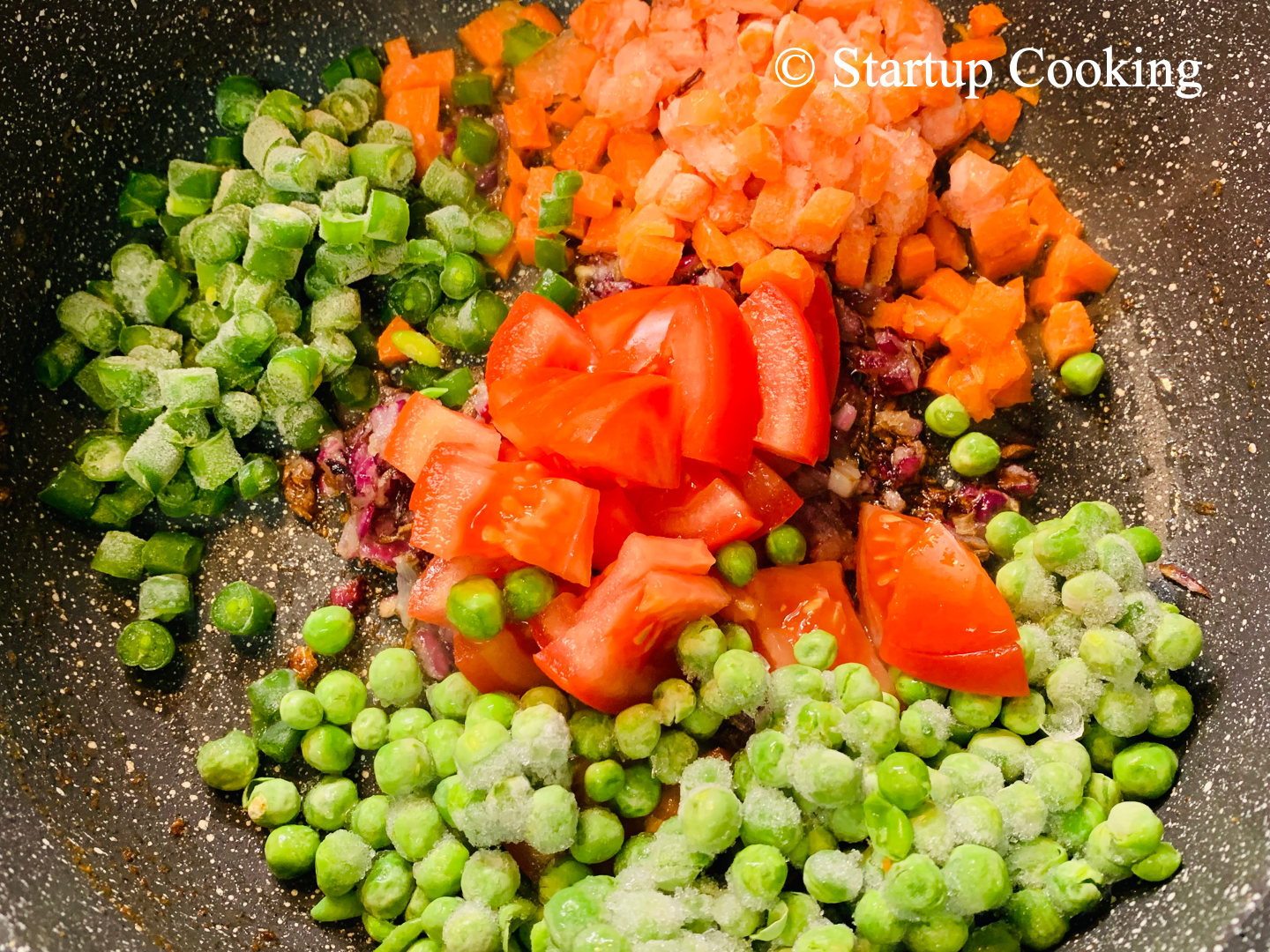 add chopped tomato, carrot, beans and peas