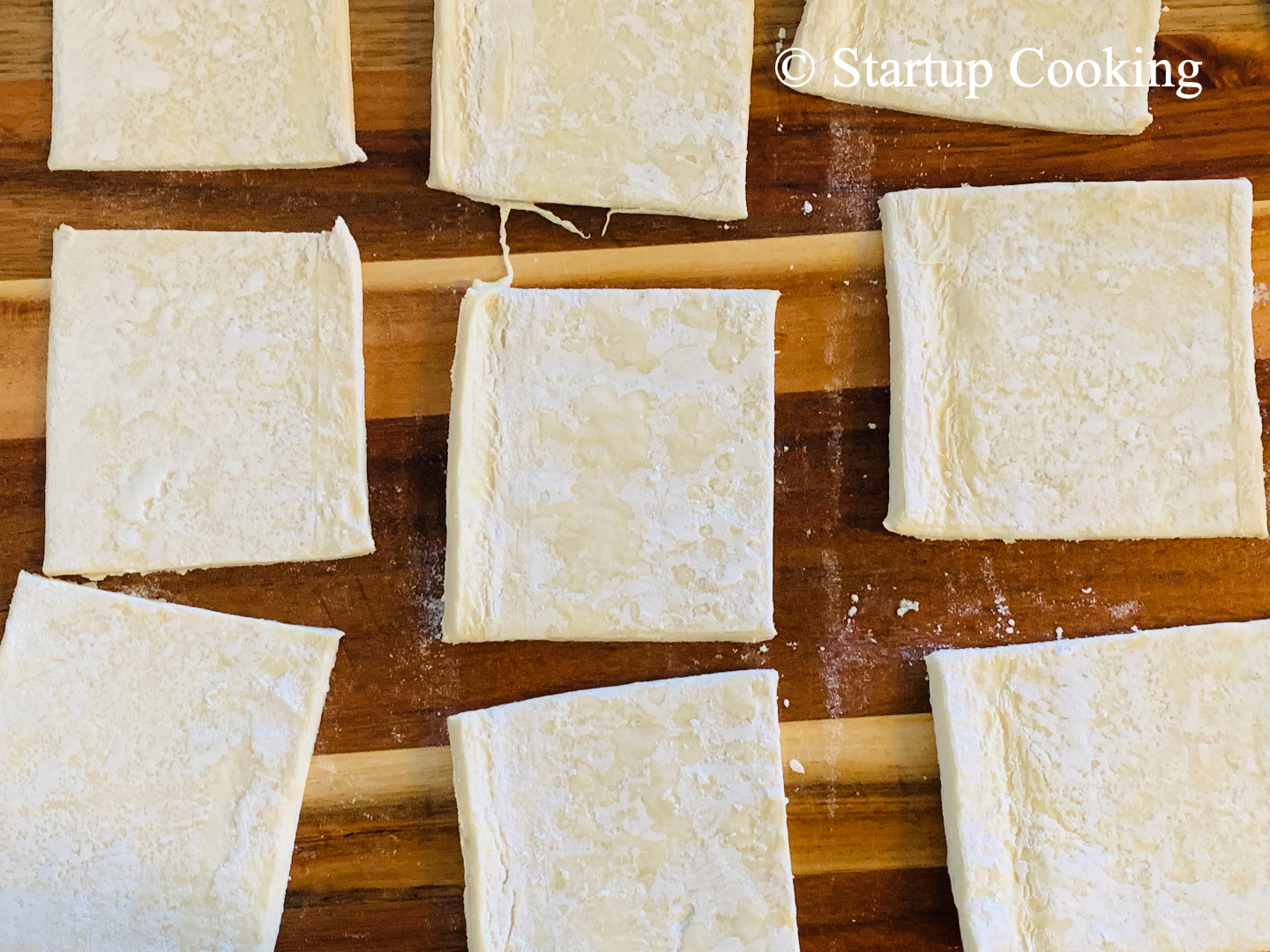 - now for the puff pastry, thaw the pastry sheet at room temperature and then cut into 4 inch squares