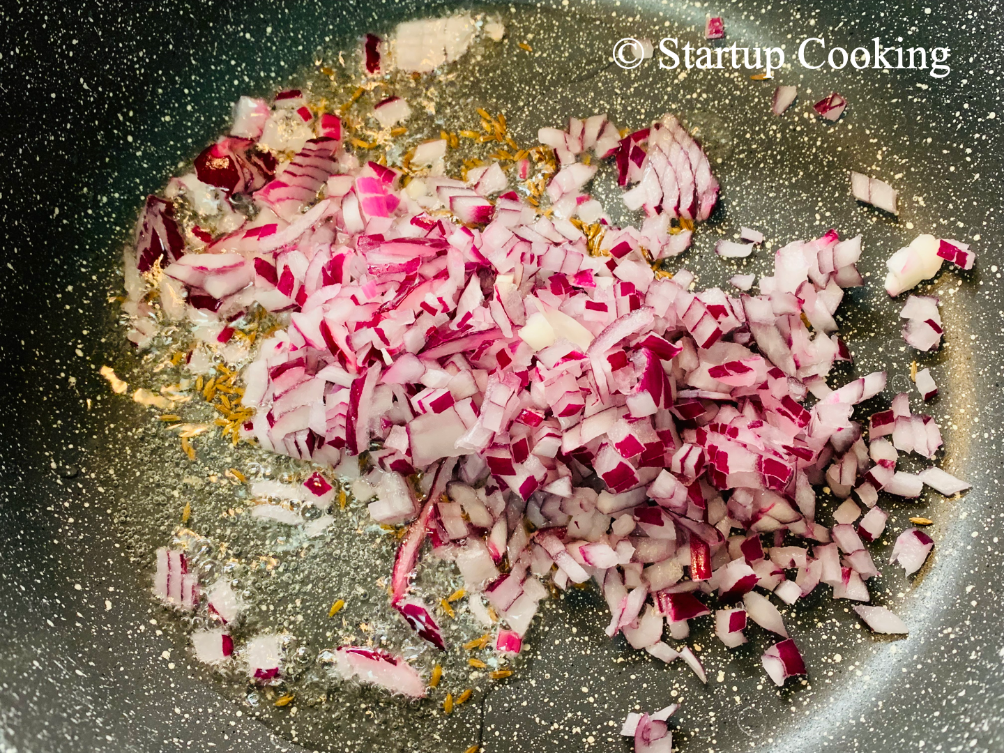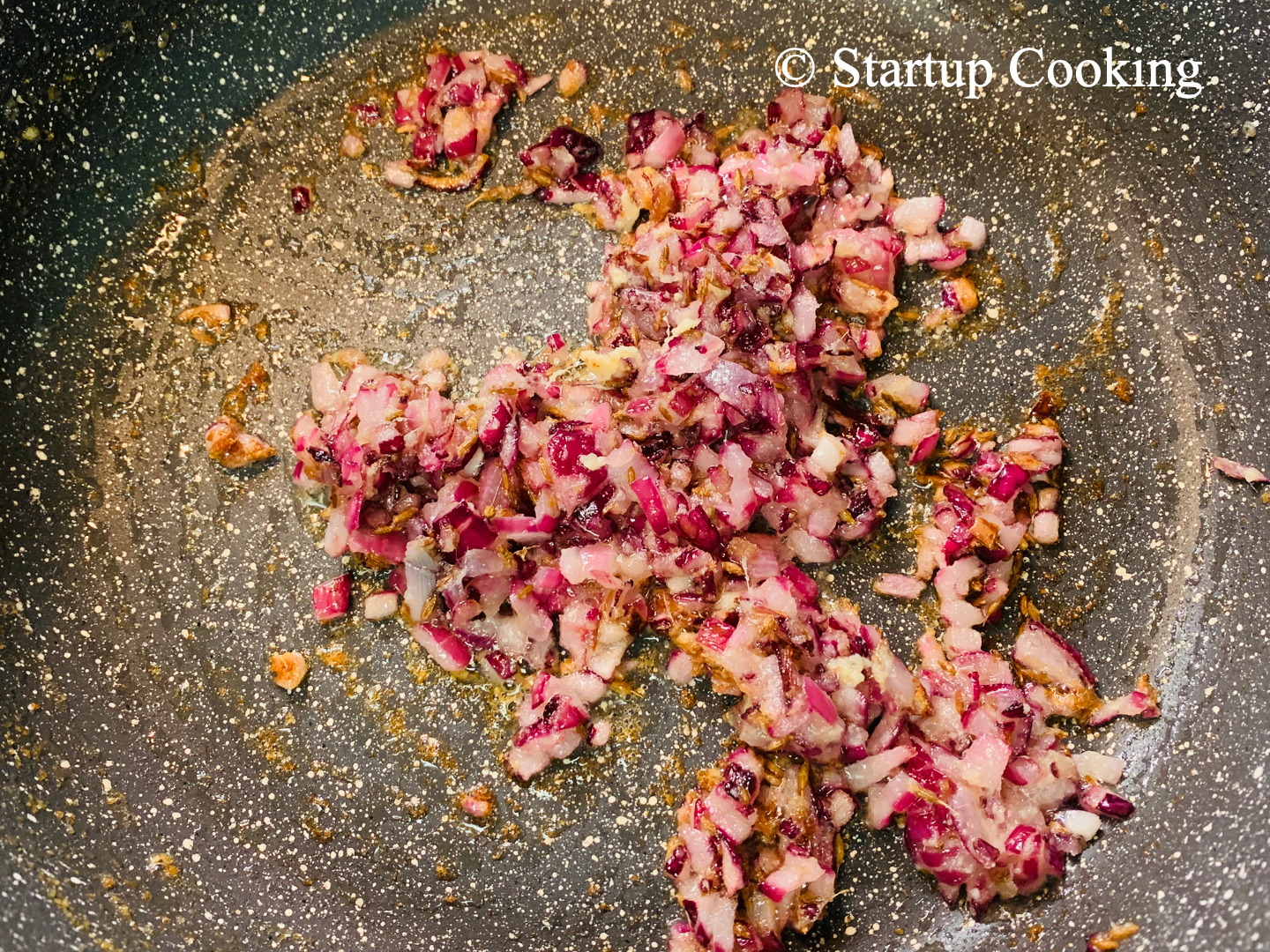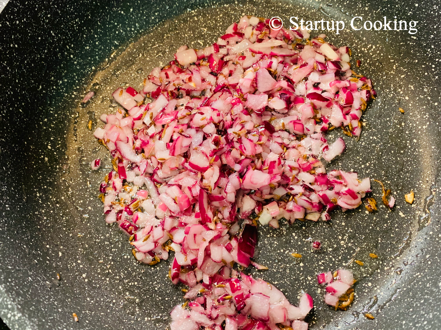 - add finely chopped onion and saute well until it turns translucent